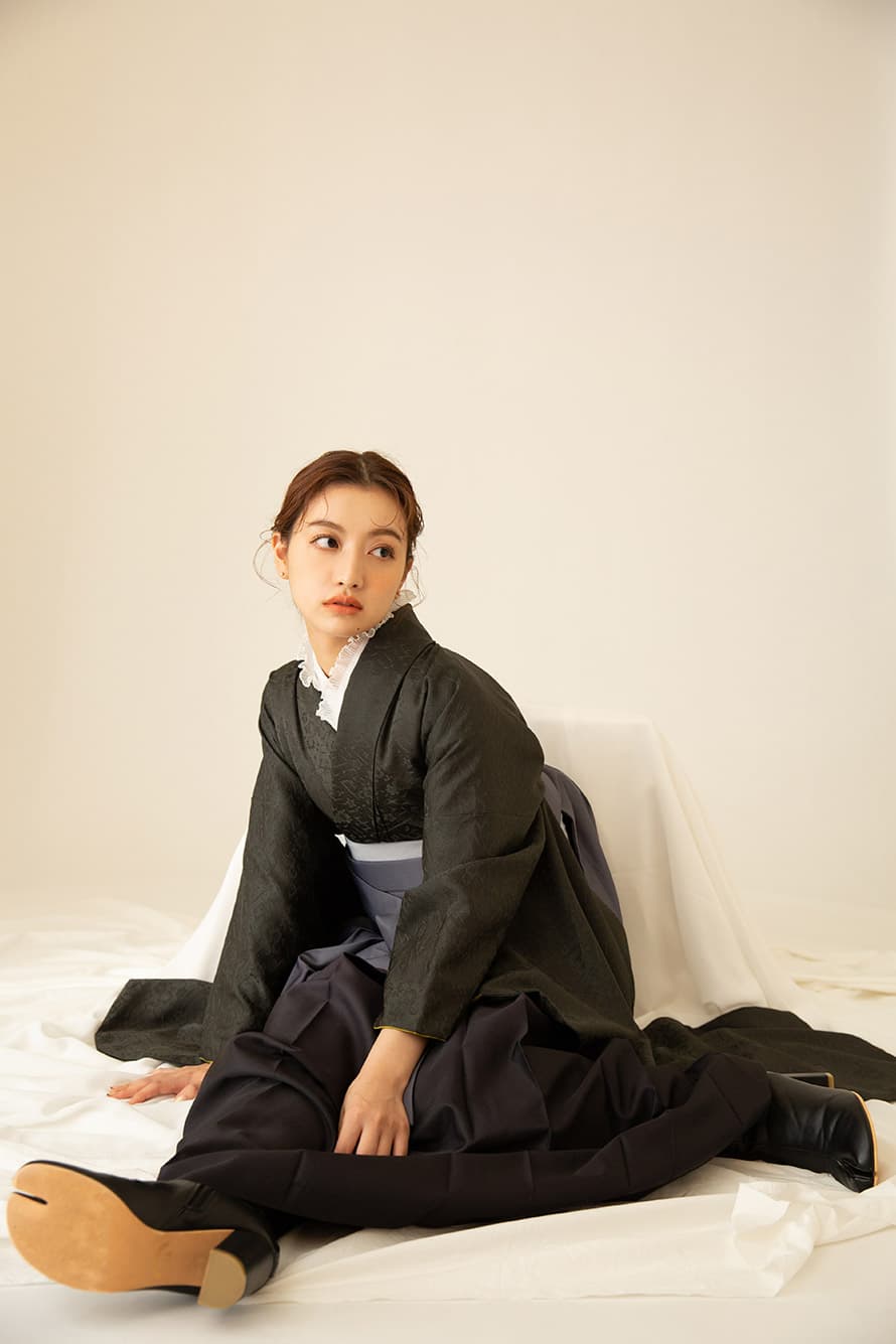 こちらは黒鶯にグラデーションの袴、フリルの襟を合わせほんのすこしガーリーに。