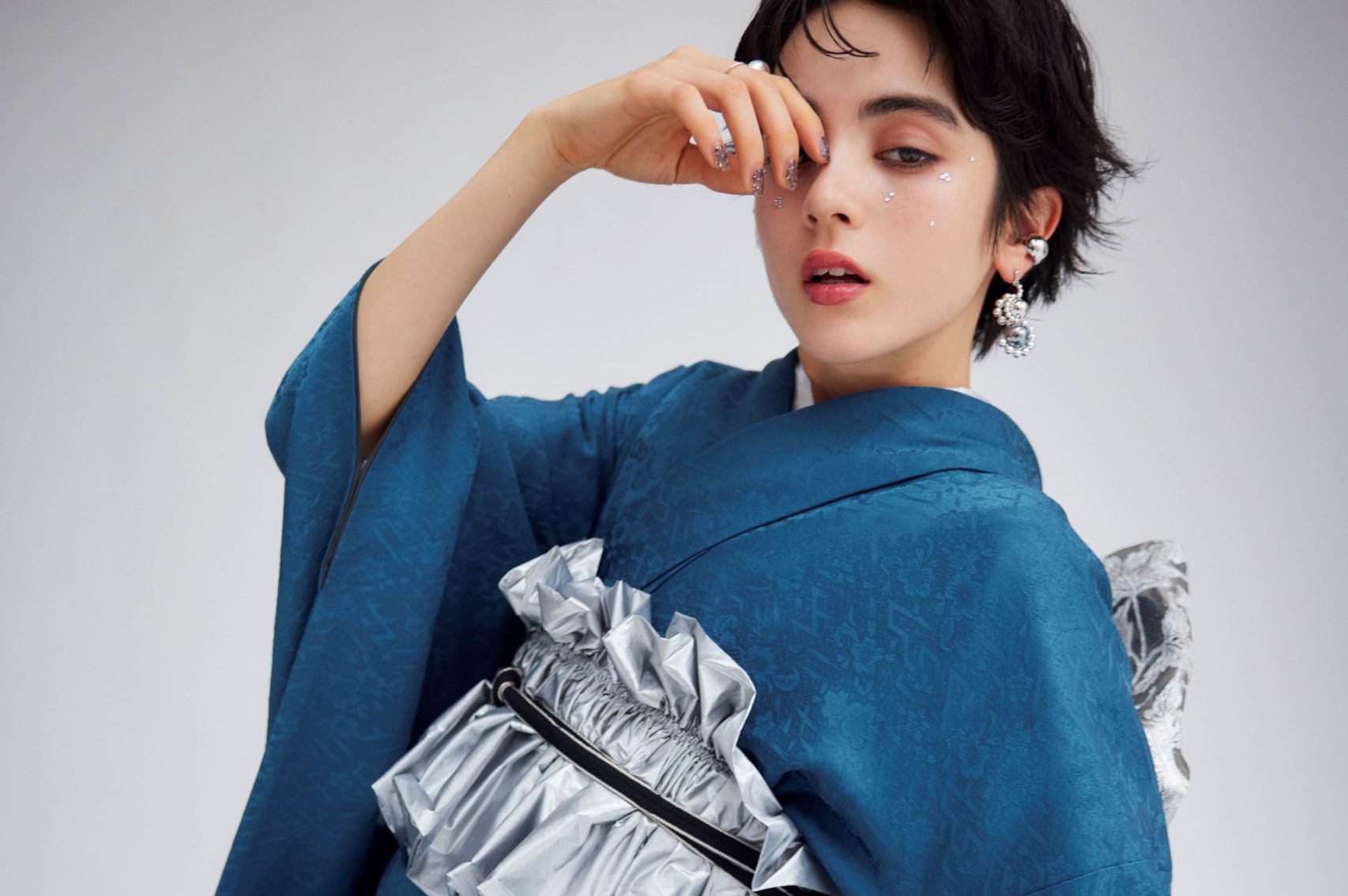 池袋で振袖を撮るなら、アクセントで差をつけて。落ち着いたカラーの振袖を、一瞬でモードに変えるメタリックフリルの...