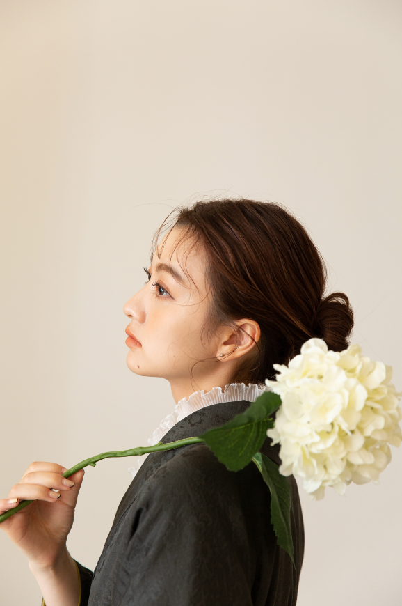 テーマは「natural chic」でaimmeオリジナル振袖「墨鶯」を使用した、大人っぽさも兼ねた個性派スタイルです。