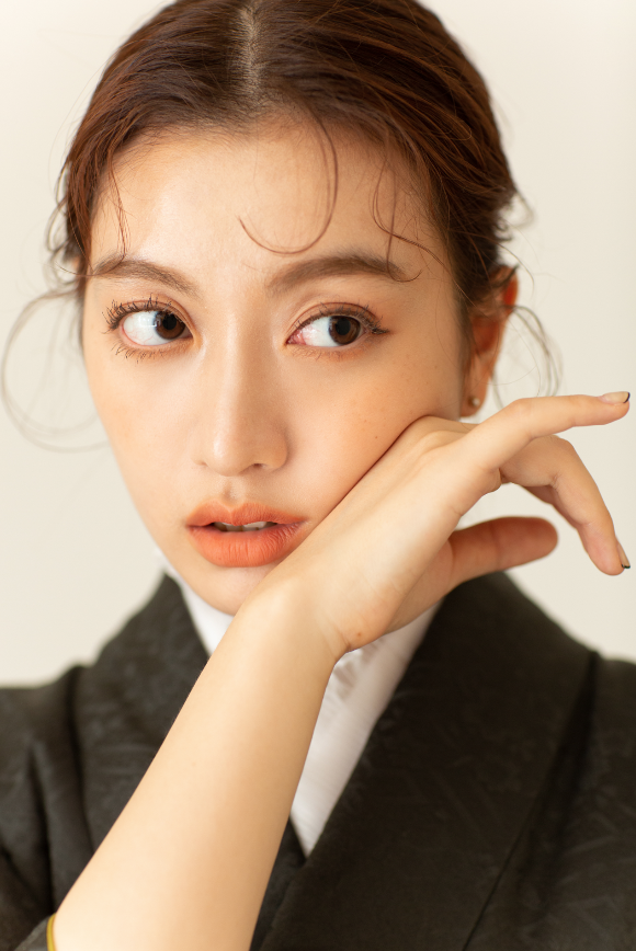 スタイリングはシックですが、すこし脱力感のあるポーズと表情、無造作なヘアメイクで柔らかい雰囲気。