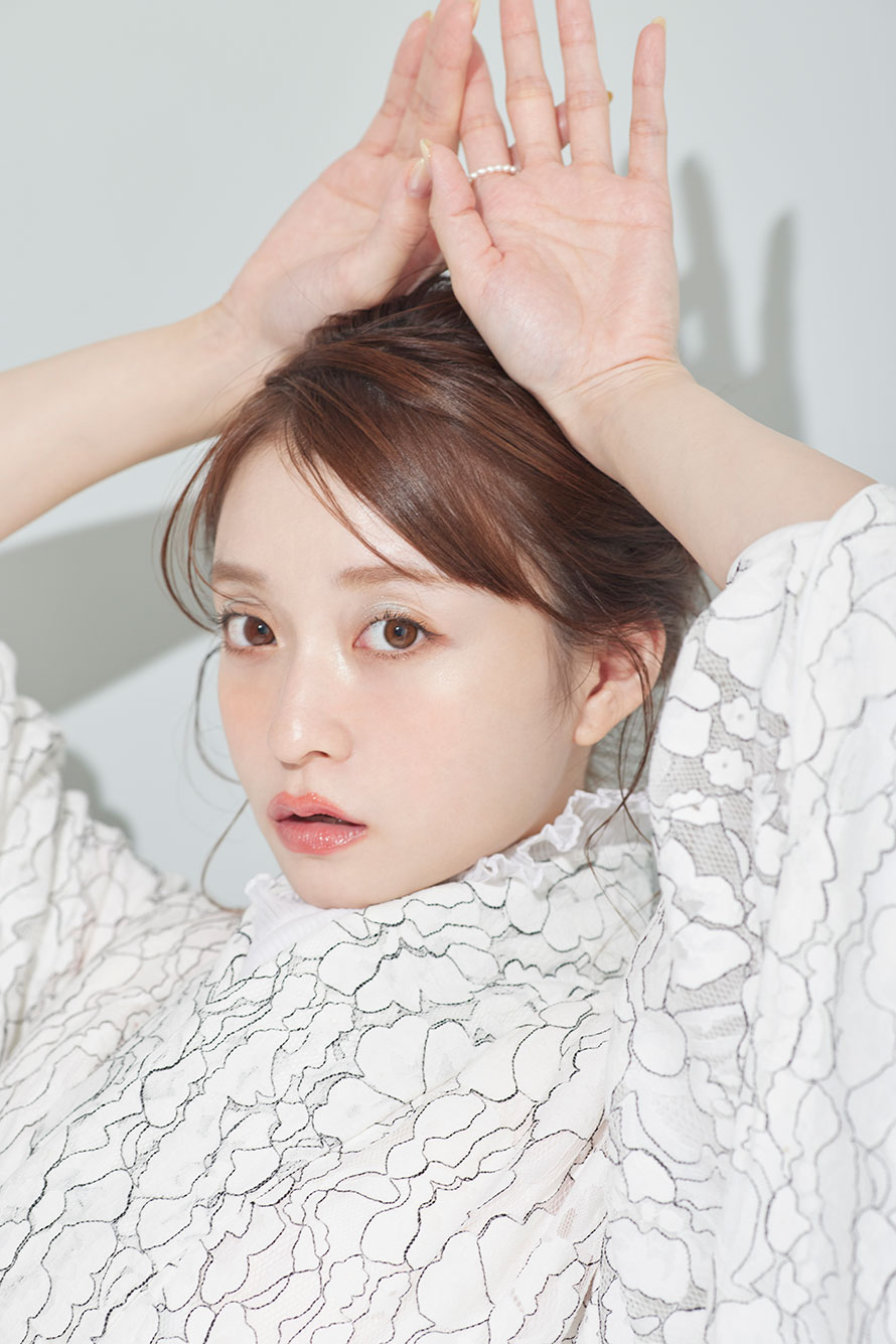 メイクもアイスブルーのアイシャドウに、コーラルカラーのチーク、リップでキュートに。
