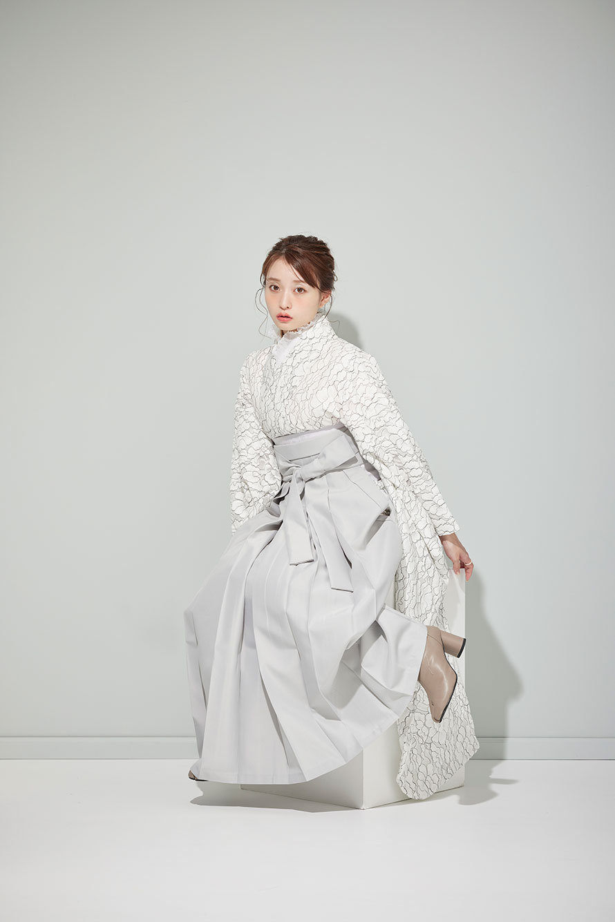 白基調の振袖にライトグレーの袴を合わせたコーデ。