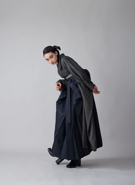 モカカラーの袴、ブーツとホワイトフリルの襟を合わせてフェミニンに。