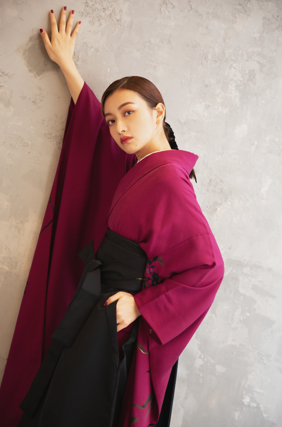 1点物のヴィンテージ振袖に袴を合わせたオリジナルスタイル。