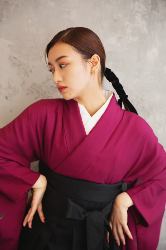 ビビッドな色合いに黒い袴と黒い足袋ブーツでシックなコーディネートに。