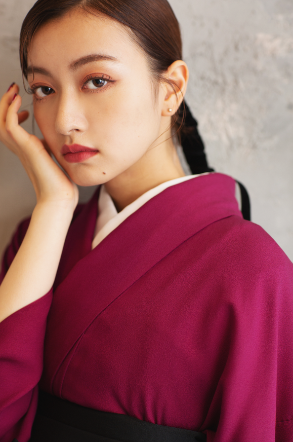 自然光や室内灯、光の当たり方で色の見え方が変わる赤紫の振袖。