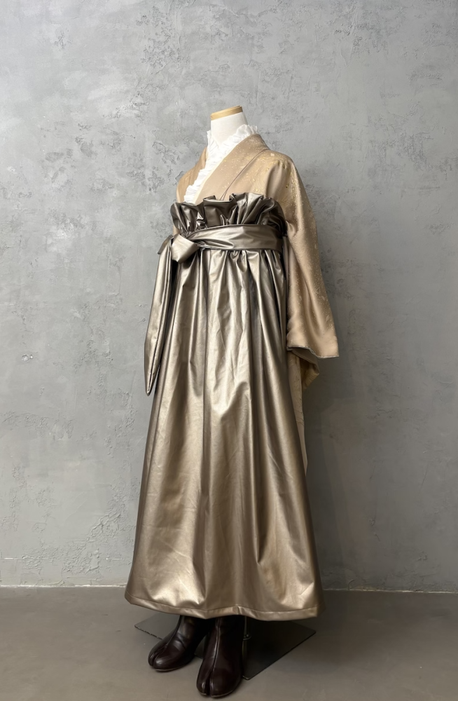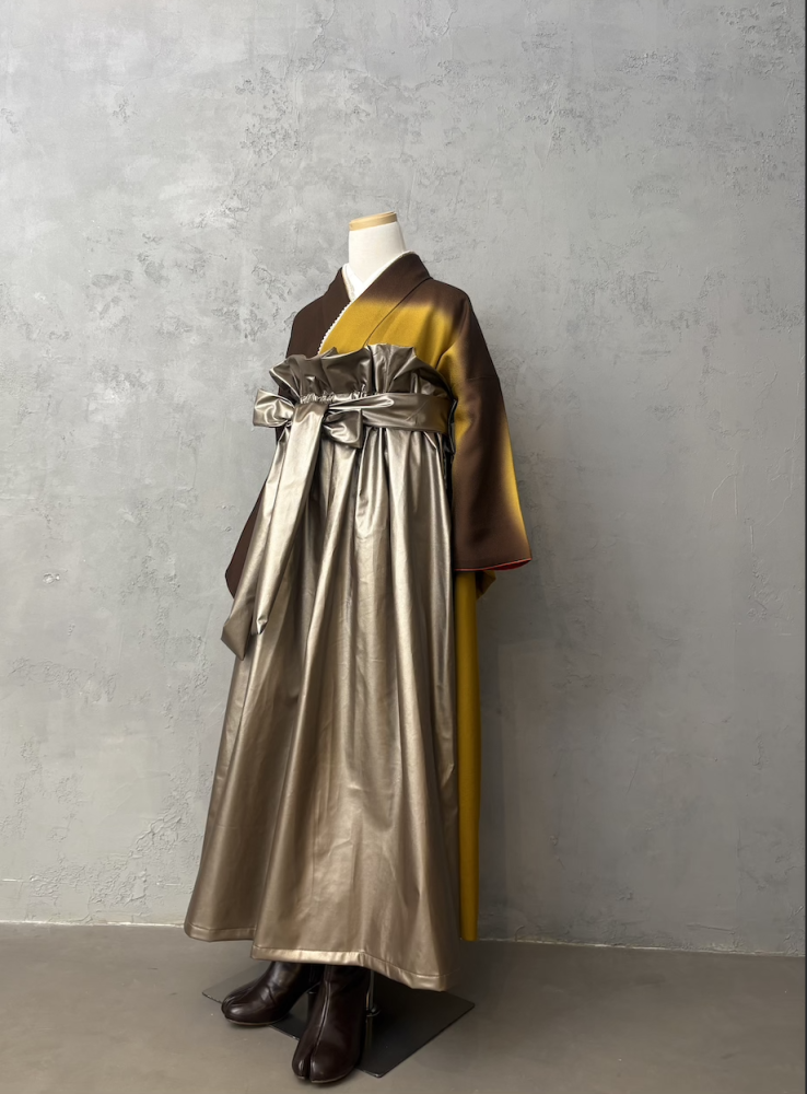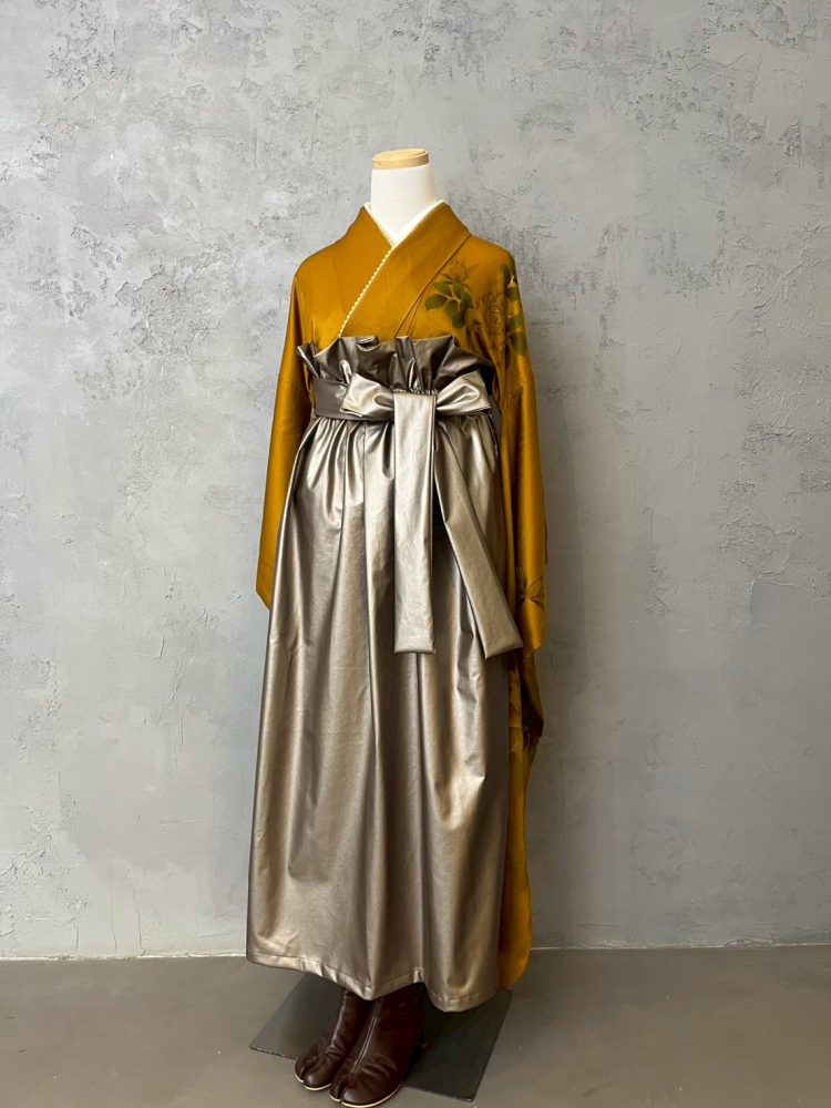 ブラウンとイエローが混ざったビンテージ振袖との組み合わせで少しクールに。