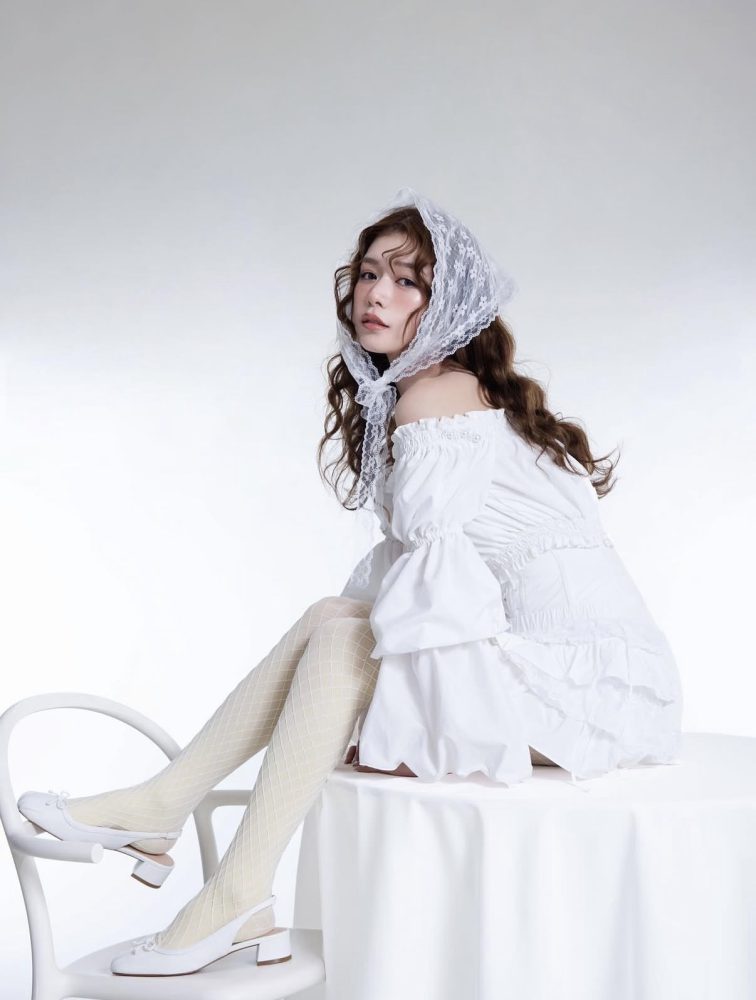 あえて白タイツとフラットなバレエシューズを合わせることで、甘くなりすぎない「引き算の美学」を。