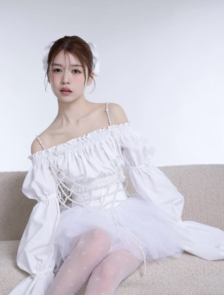 オフショルブラウスに軽やかなチュールスカート、そして目を引くのは全身に纏った繊細なパールのネットです。