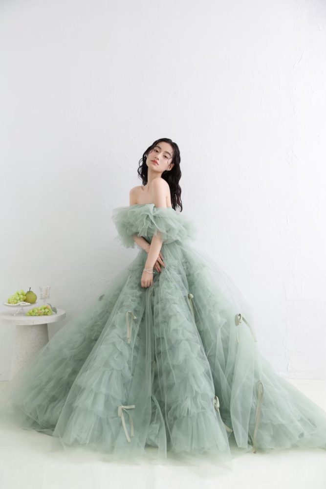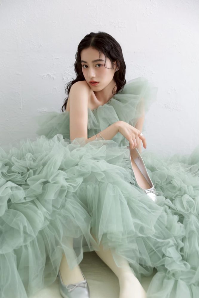 デコルテを華奢に見せつつ、動くたびにふんわりと揺れる様子はまさに妖精。