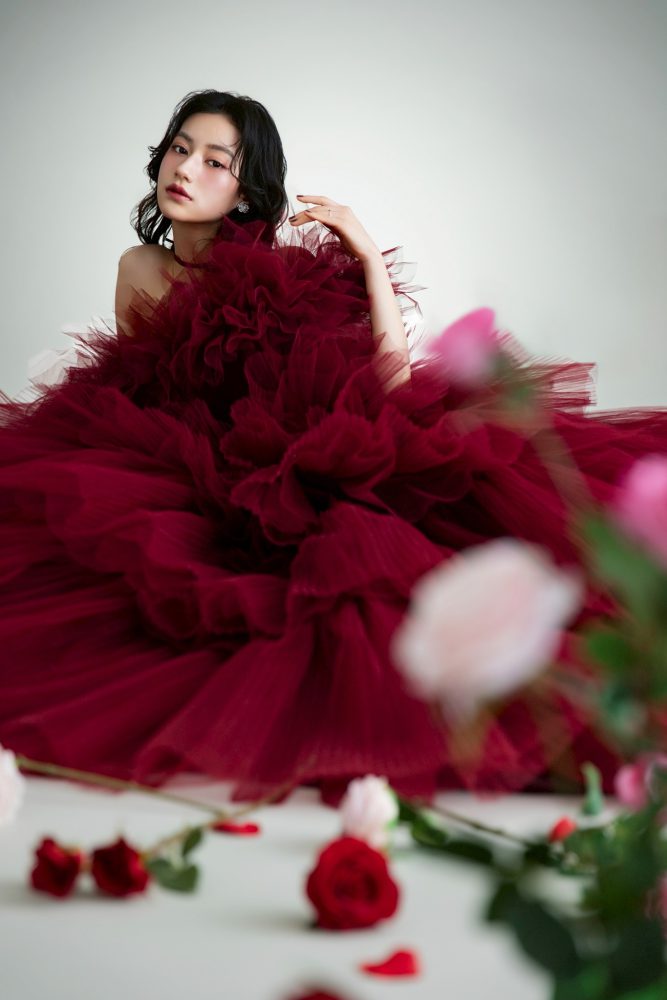 まるで大輪の薔薇そのものを纏っているかのような、立体的なチュールの重なりがドラマチックです。