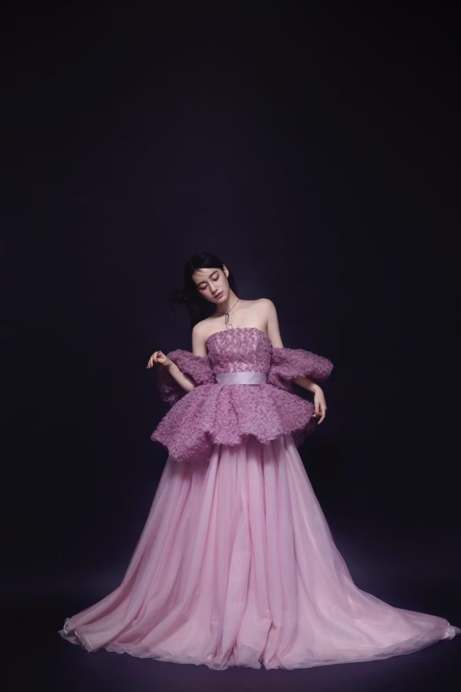 ラベンダーカラーの立体感あるペプラムトップスに、淡いピンクのチュールスカートを合わせたバイカラーが新鮮。