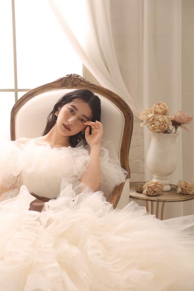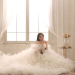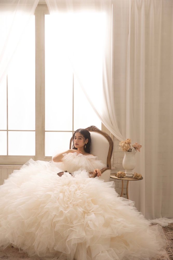 真っ白な雲を纏っているかのような、圧倒的なボリュームのチュールドレス。