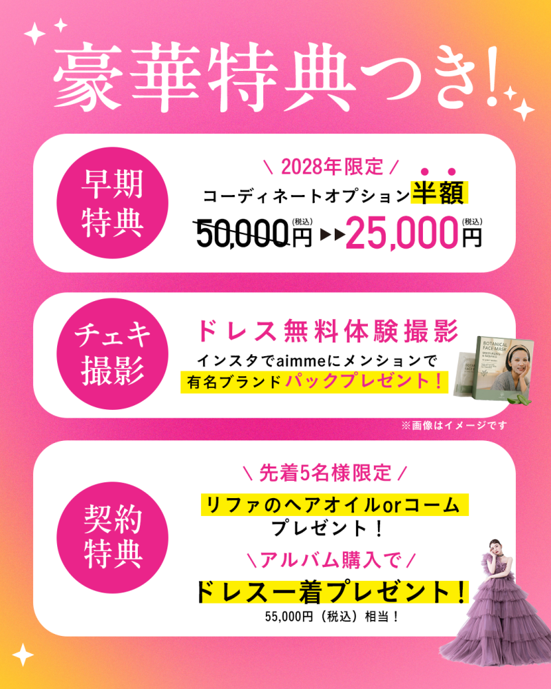早期予約ならではの限定特典はもちろん、たくさんの種類の中から理想の一着をじっくり選べるのは今だけ。