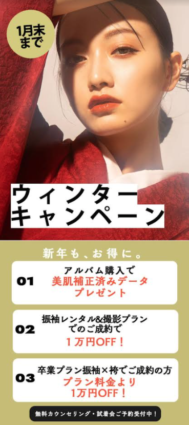 振袖レンタル&撮影プランご成約で合計金額から1万OFF!