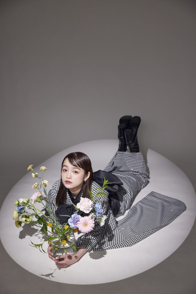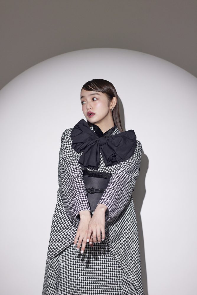 帯には深いブラックを合わせ、大きなリボンを添えることで、甘さとクールさを絶妙にミックス。