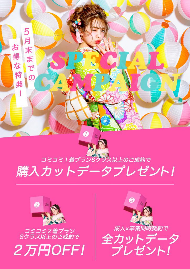 前撮りorコミコミ振袖レンタルプラン+卒業式衣装レンタルプランを同時でご契約頂いた方対象です!