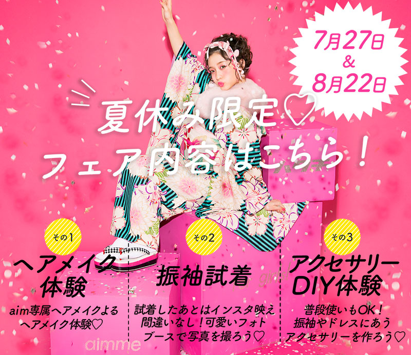 aimの可愛い振袖1着をレンタルし、着付け・ヘアセットが含まれたプラン!