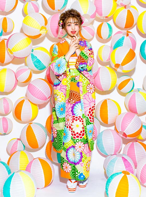 リップはビビッドオレンジで振袖に負けないPOPな色使いに。