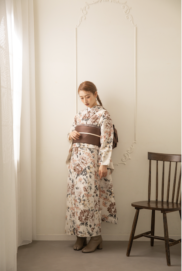 コーディネートにはブラウンの帯を合わせており、落ち着きのある大人な雰囲気です。