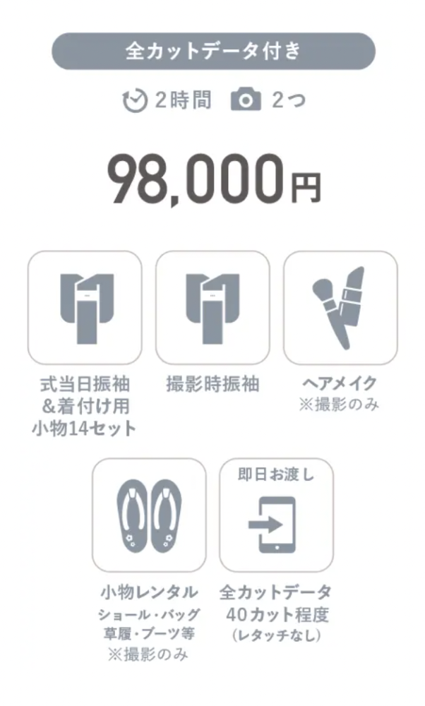 お式当日に振袖が借りられて、撮影もセットでついてくるお得なプランです。