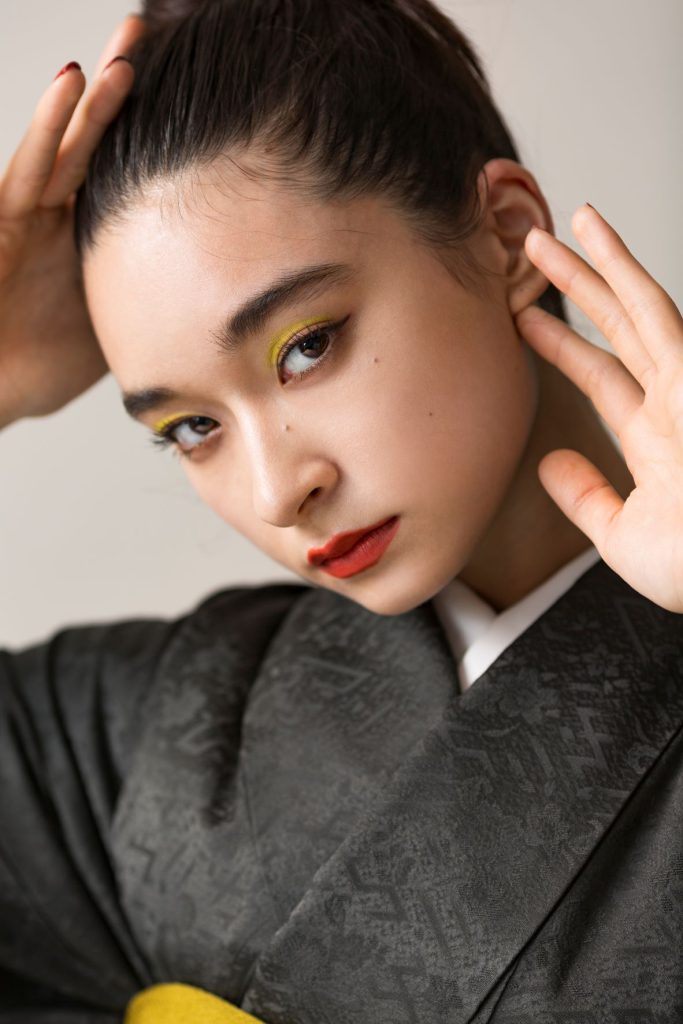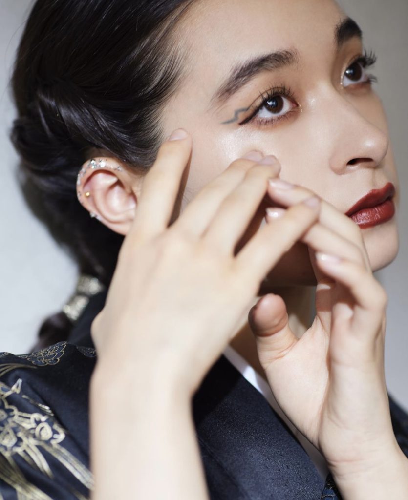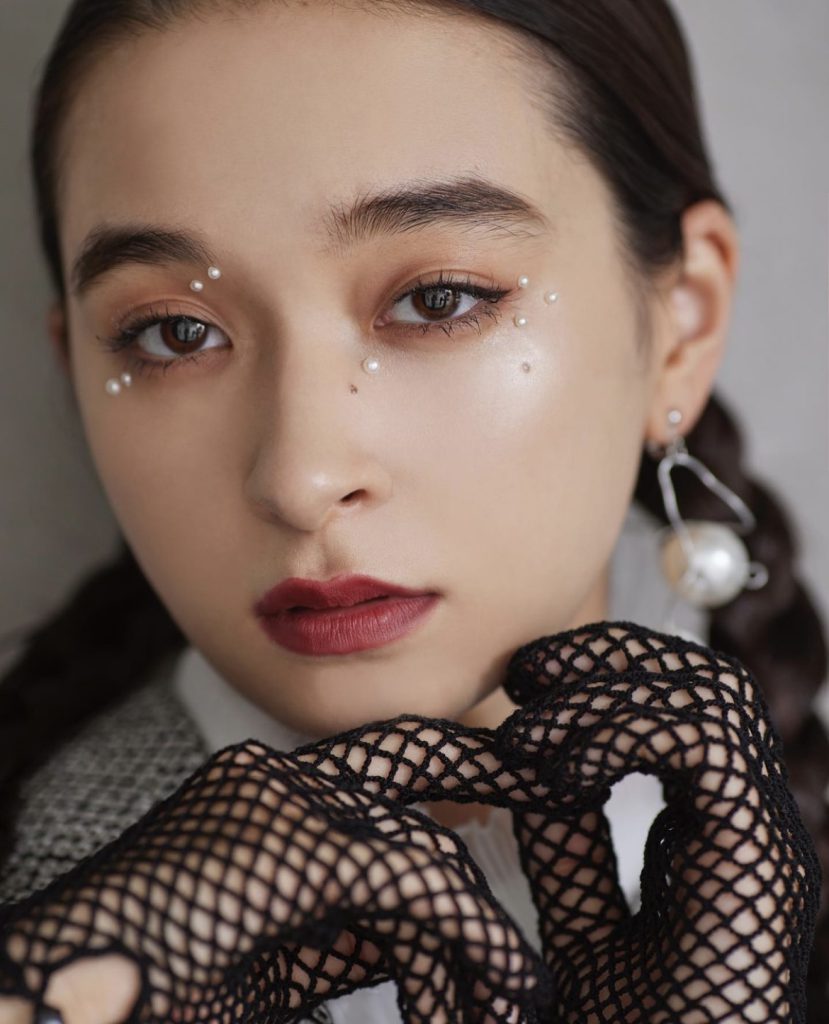 目の周りやアイラインに沿って立体的なパールや金箔を散りばめ、クリエイティブな発想をメイクにたっぷり詰めました。