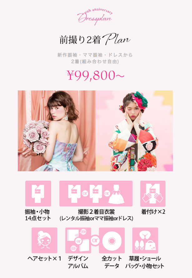 前撮り振袖1着プラン/1万円OFF!! 前撮り振袖&ドレスプラン/2万円OFF!!