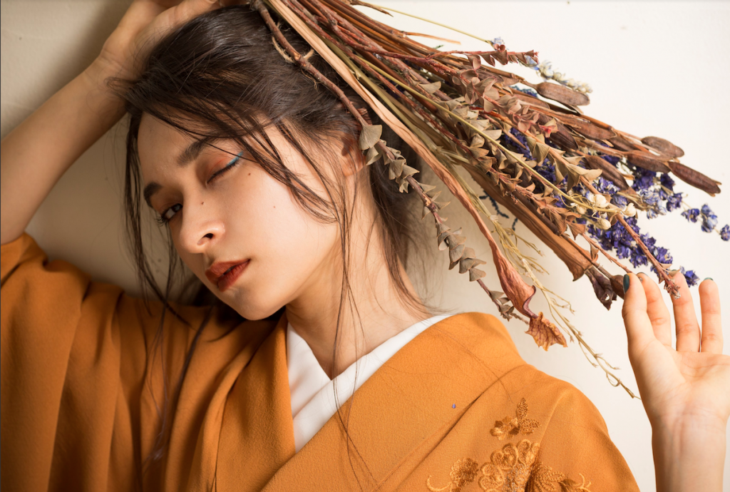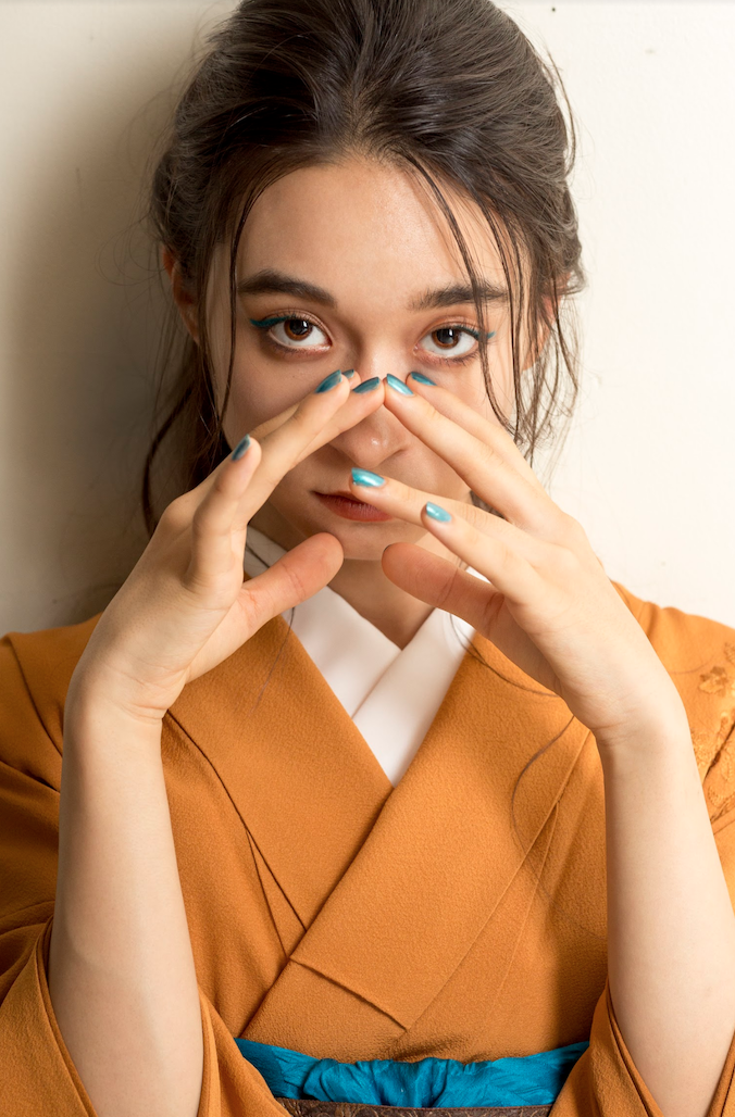 お顔、お衣装、手元に同じ色をさりげなくリンクさせておしゃれに。