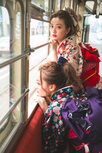 市電と振袖なんて合うの?と思われるお客様もいるかと思いますが、お振袖の和の雰囲気が市電にマッチして特別な一枚に。