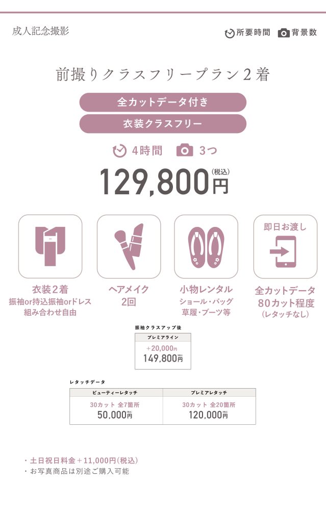 新プラン「前撮りクラスフリー2着プラン」では選ぶ振袖によって金額が変わる心配がほとんどありません。