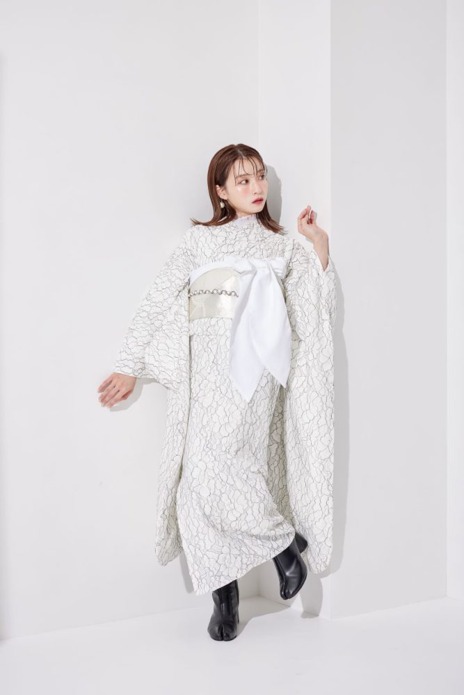 透明感のある上質なホワイトレースが魅力溢れる総柄のニュートレンド振袖。