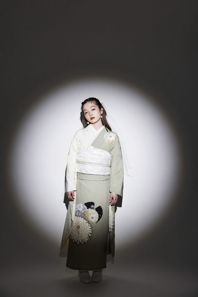 和の雰囲気を漂わせる肩と裾にあしらわれた大きな白菊をポイントに、
