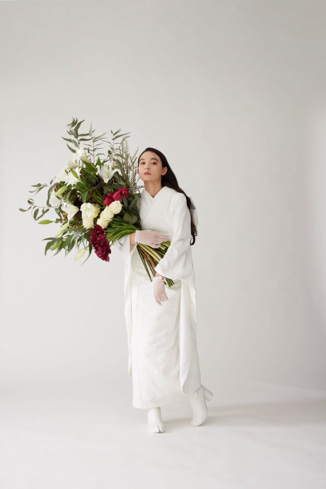 装花を使ったポージングもオススメ。お花を抱いたり、顔に近づけることで、表情まで華やかに見せることが出来ます。