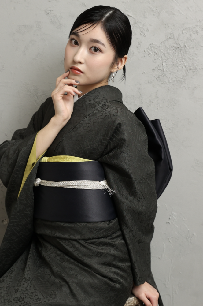墨のような淡い黒に、裏地の鶯色がアクセント。上品な色合いで洗練された印象に。