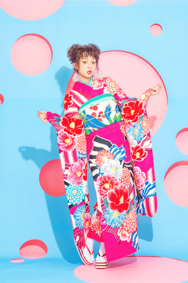 aimの可愛い振袖1着をレンタルし、着付け・ヘアセットが含まれたプラン!