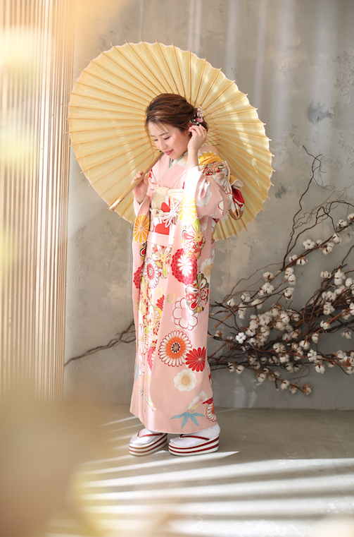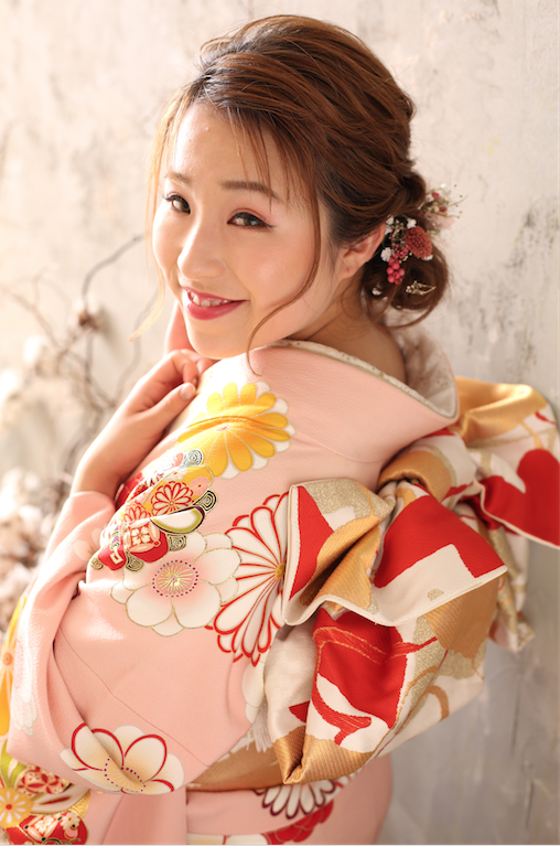 髪飾りはピンクのフラワーで大人っぽさを。