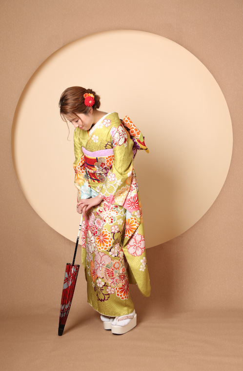 鶯色のレトロ振袖に背景は大人っぽく。