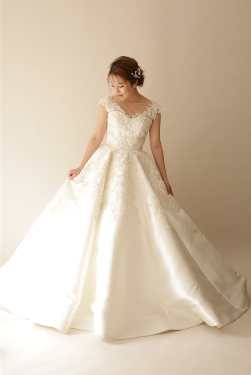 サテン生地のコチラのドレス。胸元から下にかけて繊細な刺繍デザインが特徴。