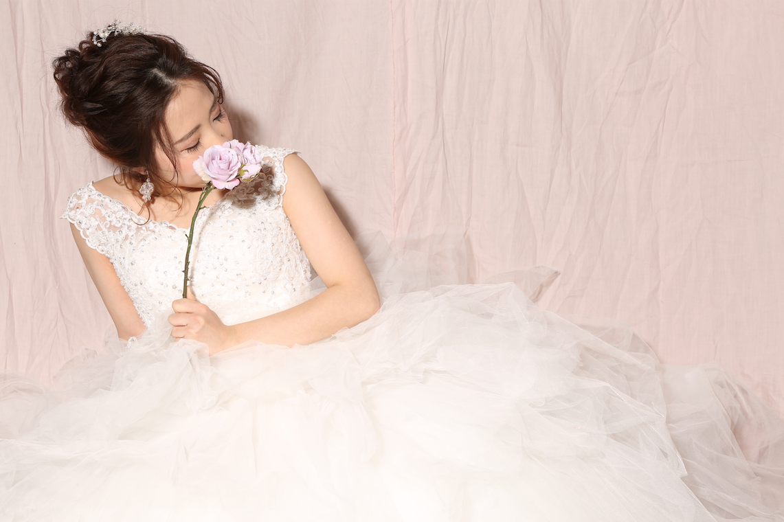 甘い雰囲気のドレスに一輪のお花を持つことによって大人な女性にグンッと近づけます。