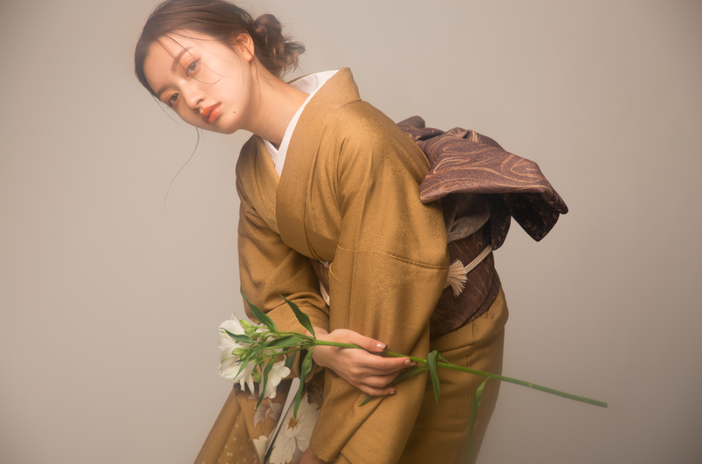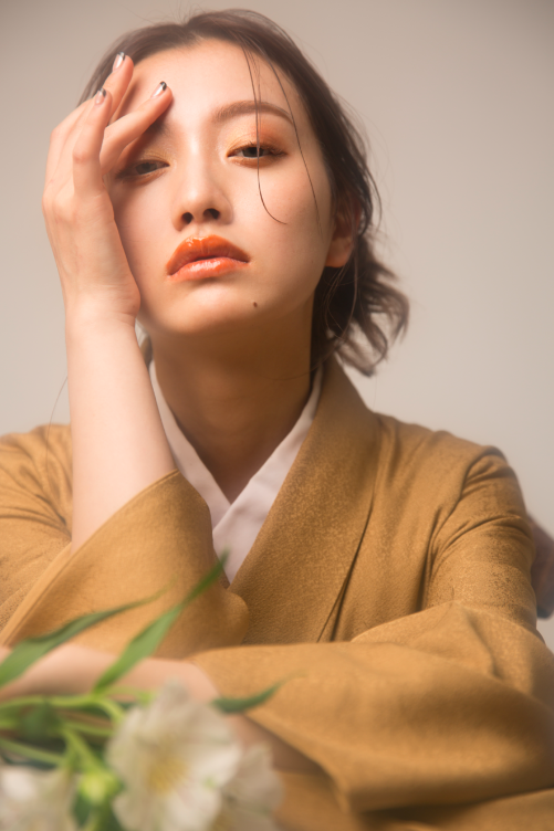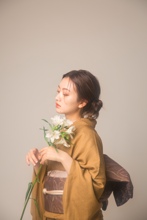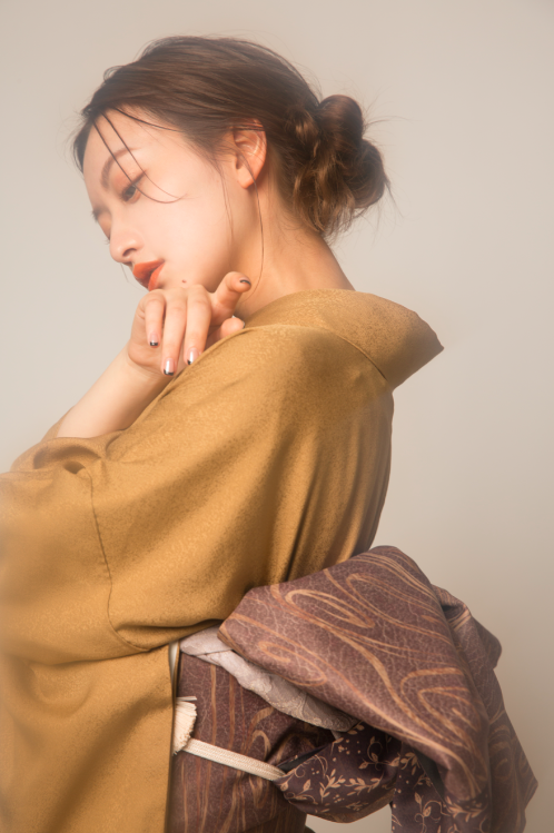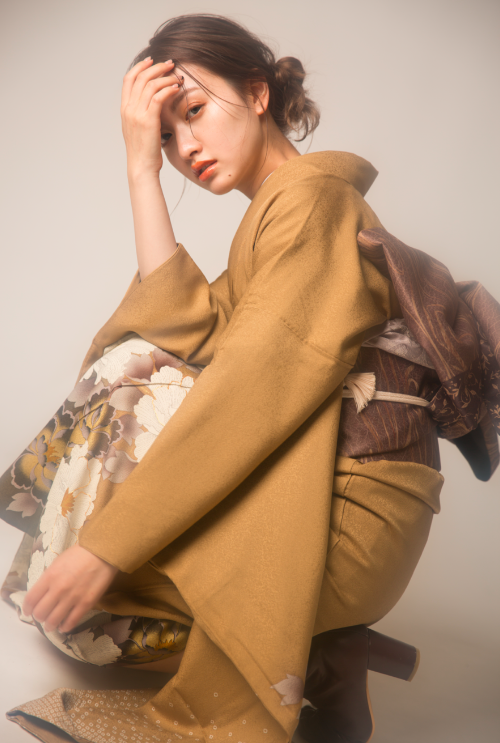 「今までaimme札幌店にはなかった上品なベージュ系の振袖。それに合う気品ある女性らしさと抜け感をミックスさせたい。表情は大人っぽく抜けかんのあるアンニュイなイメージで、ポーズもキメる感じではなく、上品めに崩す。そんな風に考えてました。ヘアは上品すぎずに少し無造作にまとめたお団子ヘア。ここで抜け感の演出をさせて、女性らしさを出しました。メイクはくすみオレンジ系とゴールドを使ったでアンニュイメイク。ほどよいツヤ感を出しました。」