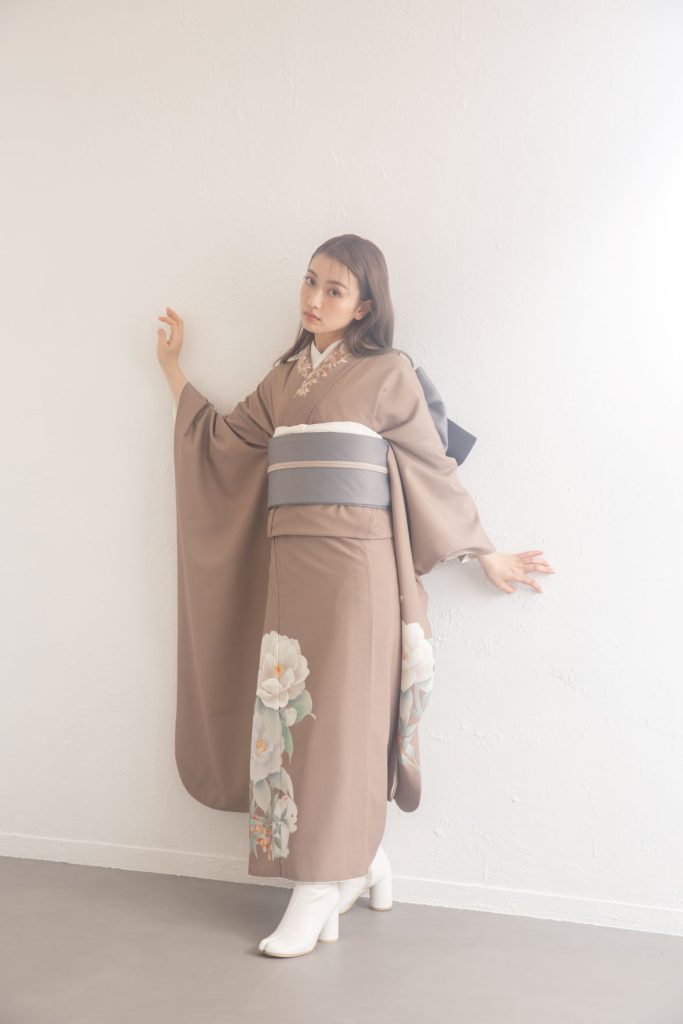 帯小物はブラウンでモダンな雰囲気に仕上げ、