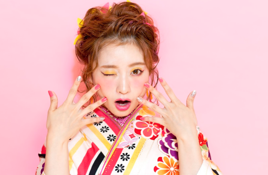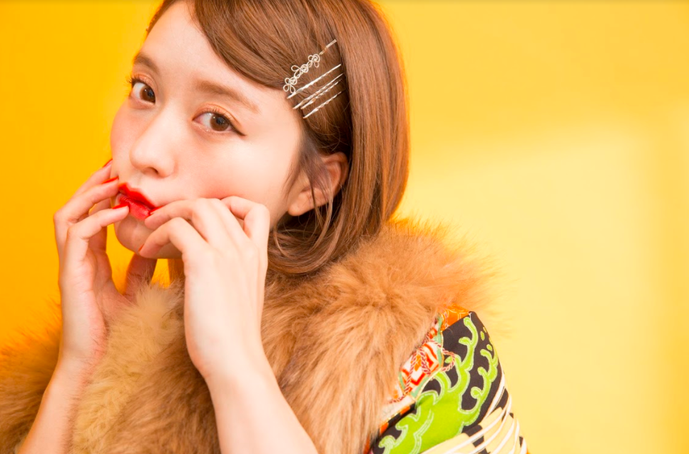 メイクは着物に負けないイエロー×ピンクのキュートなカラーメイク。