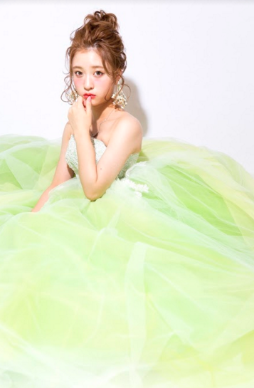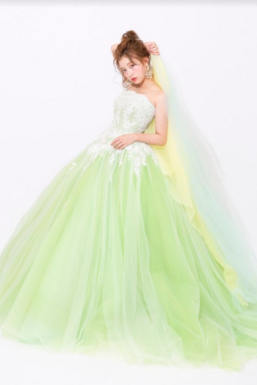 胸元の刺繍が上品なグリーンのドレス。何層にも色を重ねたチュールがふんわりかわいい1着です。