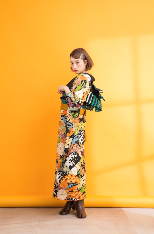帯はあえてメリハリをつけるためにブルーで締め、少し柔らかい印象にするために帯揚げと扱きをからし色に。