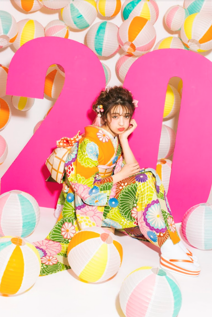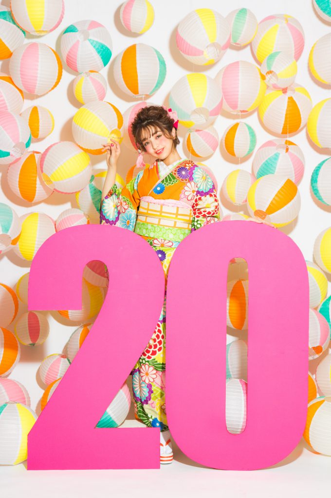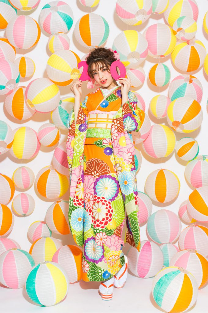背景は振袖に合わせたカラフルな提灯が春夏を連想する様な爽やかな色合いで季節感を演出!