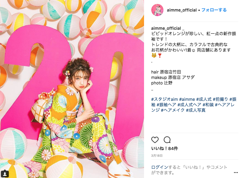 aimの可愛い振袖1着をレンタルし、着付け・ヘアセットが含まれたプラン!