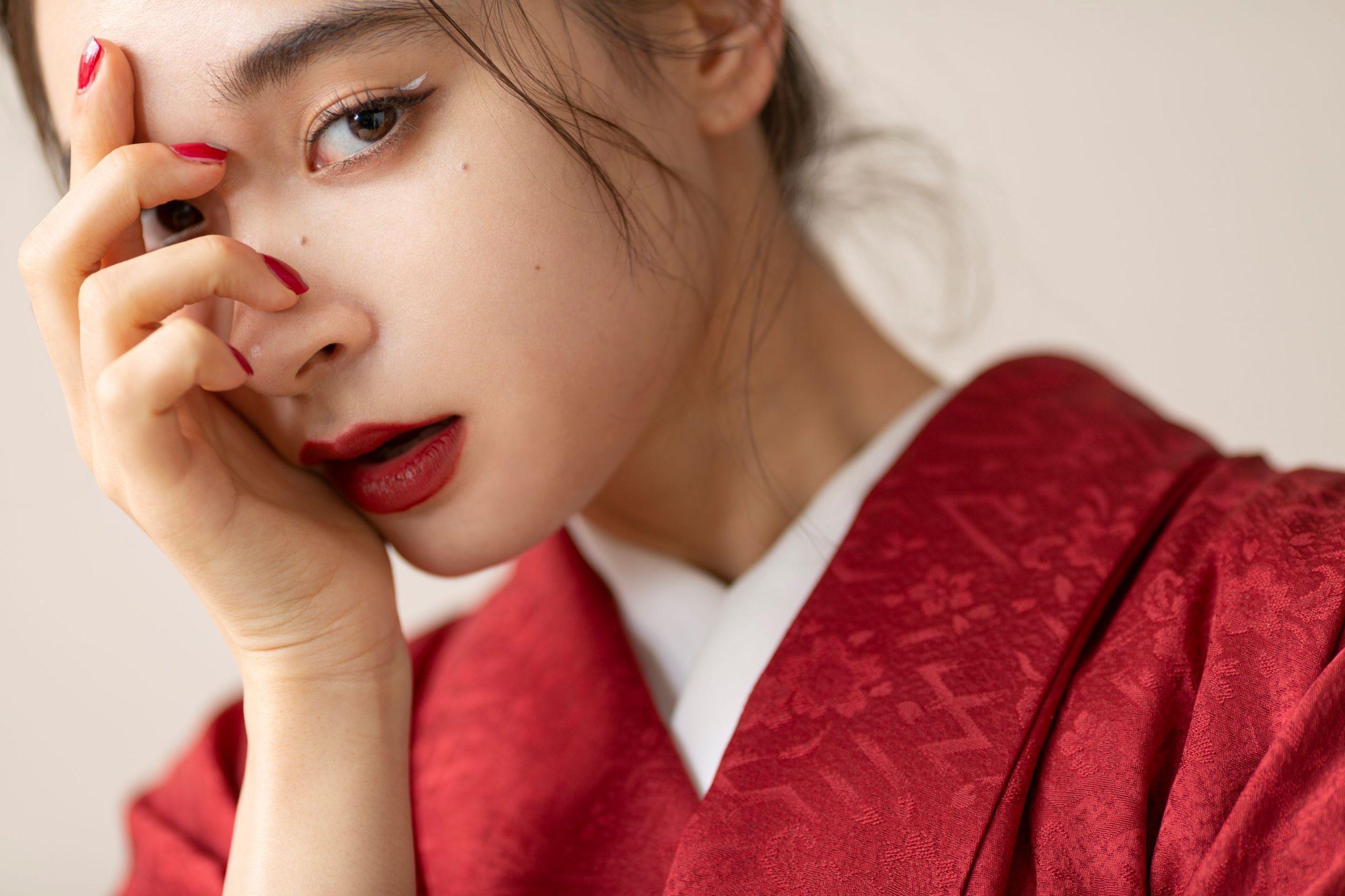 モノトーンが人気な今だからこそ自信を持っておすすめしたいaimmeの赤色振袖。 貴方だけのスタイリングを見つ...