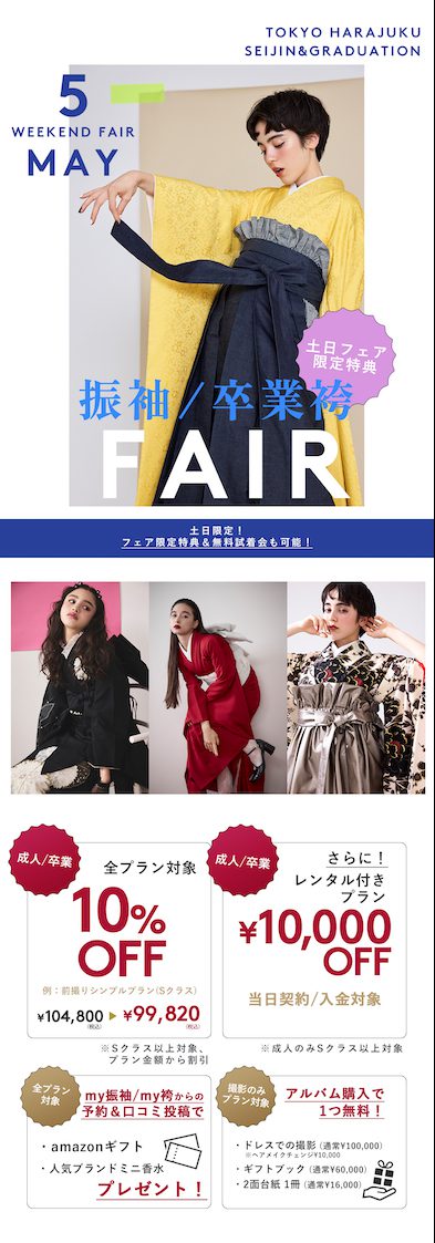 5月限定の振袖・卒業袴フェアを開催します! 親子での参加がお得!ご家族様でイメージを膨らませてくださいね♪