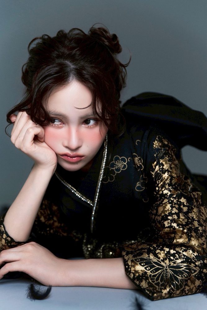 メイクのポイント: 目元の赤みを活かした「地雷系・ドーリー」な要素をプラス。伝統的な和装にミステリアスな色気を掛け合わせて。