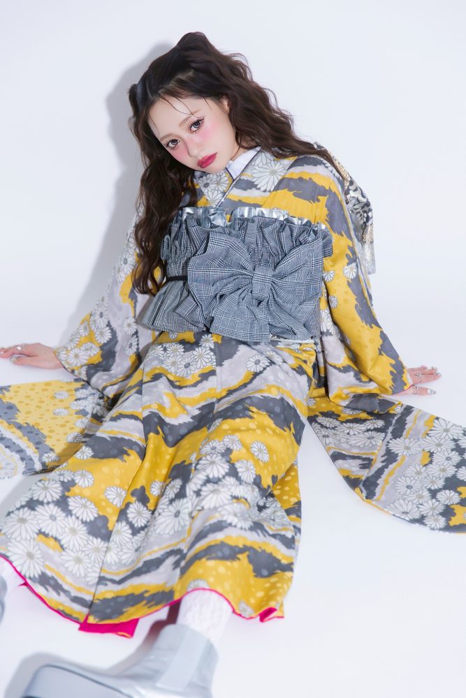 帯周りの概念を変える: チェック柄のリボンやフリルを大胆に配置。帯を「締める」のではなく「飾る」感覚で、まるでドレスのようなシルエットに。